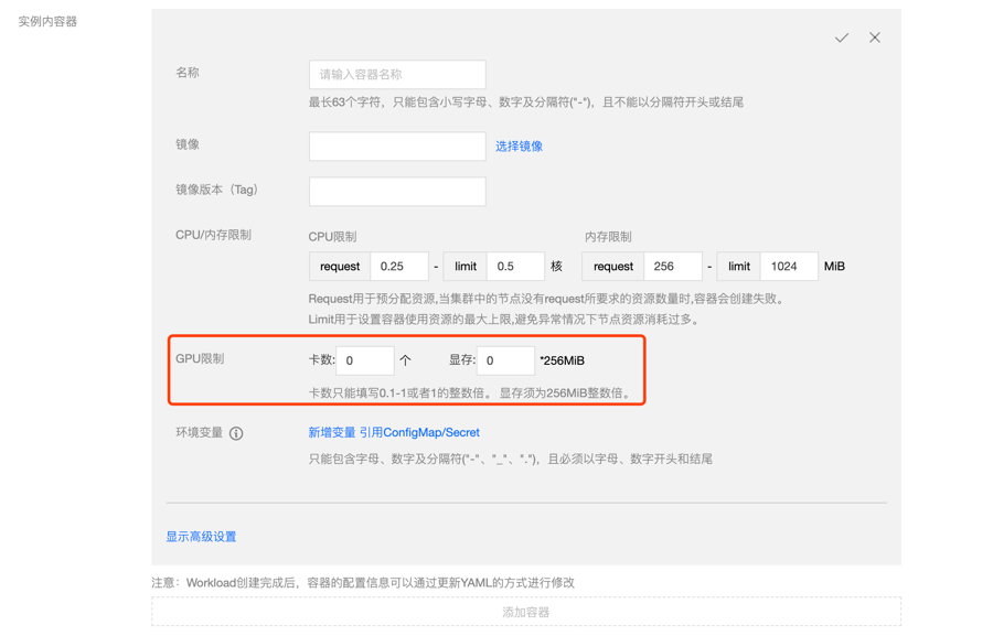 创建工作负载设置GPU限制,如图:
